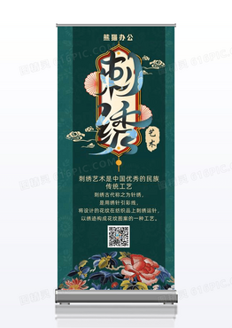 绿色传统文化刺绣技术展架易拉宝刺绣展架