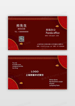 美食中式餐饮酒店名片高档简约红色折扇元素
