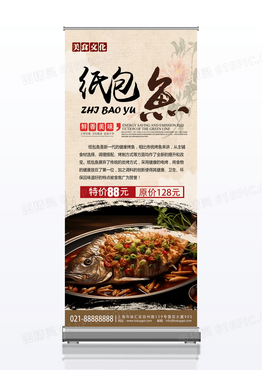 咖色水墨风纸包鱼鲜香美味美食展架易拉宝
