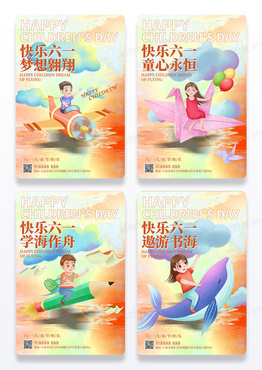 橙色梦幻风快乐六一61儿童节宣传海报组图套图