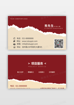 红色简约人力资源服务撕纸名片人力资源公司名片