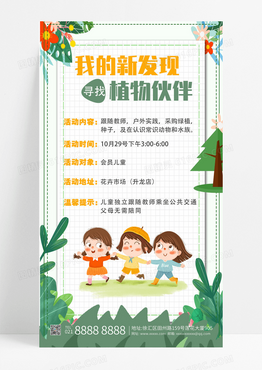 绿色清新扁平风儿童户外实践寻找植物伙伴手机海报