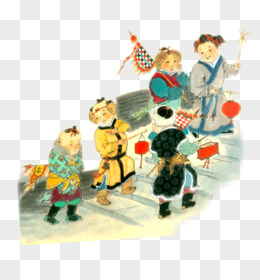 手绘卡通春节男孩女孩贴窗花场景免抠素材