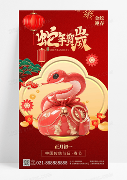 红色蛇年贺岁正月中国传统节日金蛇迎春手机海报