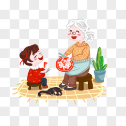 手绘祖孙二人一起剪窗花素材