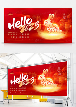 创意中国风红金唯美2023你好元旦晚会背景展板