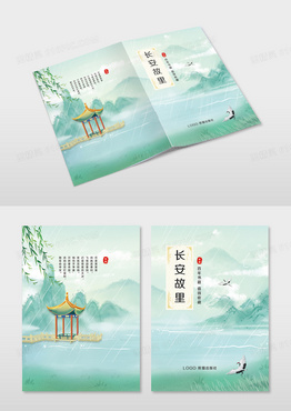 中国风初春清新山水亭子绿色水墨山水书籍封面