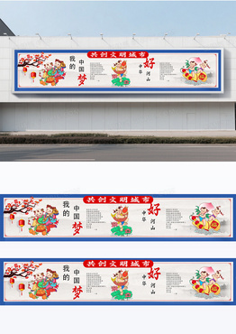 中国风蓝色中国梦公益广告文明城市创建围挡设计