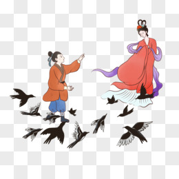 手绘牛郎织女鹊桥相会场景插画元素