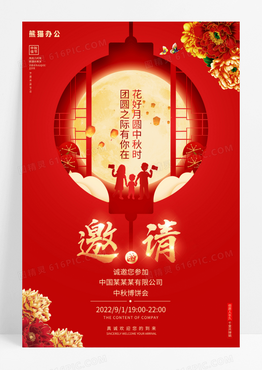 剪纸红色中秋邀请函中秋节邀请函海报