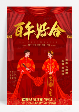 红色喜庆中式婚礼邀请海报