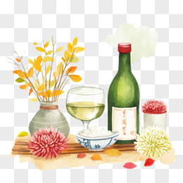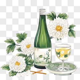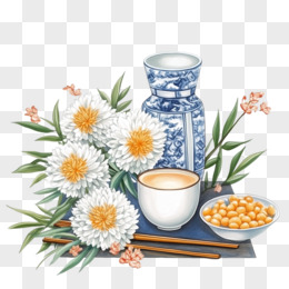 手绘茶杯山水菊花免抠创意场景免抠元素