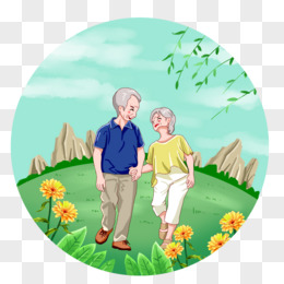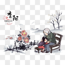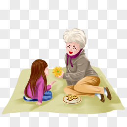 手绘卡通孙女和奶奶一起赏菊手绘插画