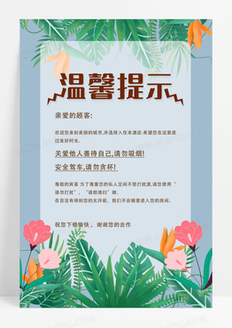 蓝色植物简约温馨提示海报酒店温馨提示卡