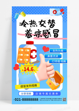 蓝色渐变药品冷热交替着凉感冒促销海报设计