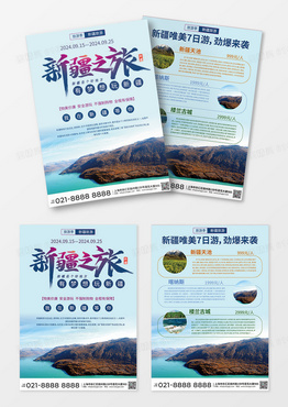 蓝色清新简约自然风光新疆旅游双面宣传海报宣传单设计