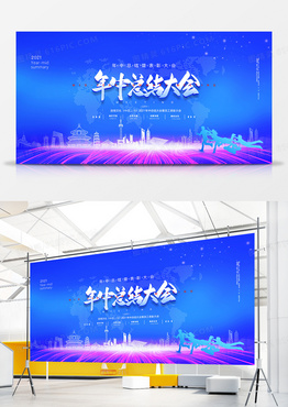 蓝色商务年中工作总结会议展板设计