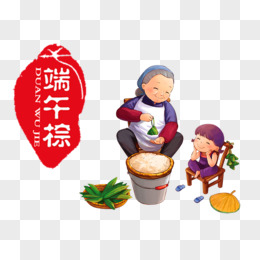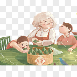 卡通手绘妈妈和孩子们一起包粽子免抠元素