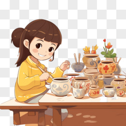 插画风小学生做陶艺免抠素材