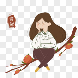 手绘卡通霜降女孩坐在柿子树上创意插画元素