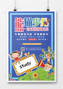 深蓝色孩群坐在地上书本看书卡通简约风熊猫少儿语数英一站式全科海报